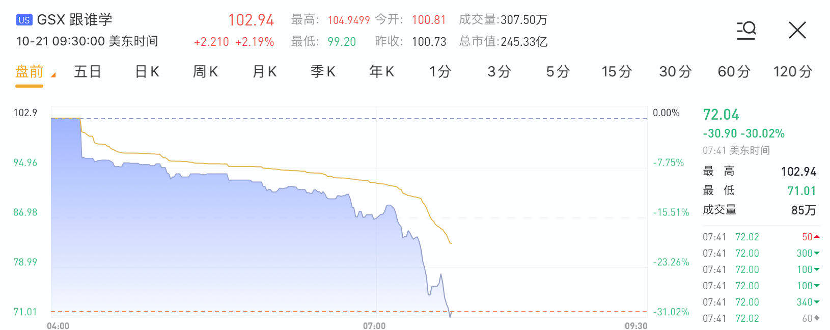 华盛资讯10月21日讯,跟谁学盘前跌幅迅速扩大至30%。截止发稿,跟谁学大跌30.02%,报72.04美元,当前成交量为85万。