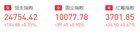 周三恒指小幅上涨,盘中最高触及24903.000点,最低下探24653.160点,截至收盘,恒指涨0.75%,报24754.420点;国企指数涨0.9%,报10077.780点;红筹指数涨0.67%,报3701.850点;大市成交额1095.04亿港元。