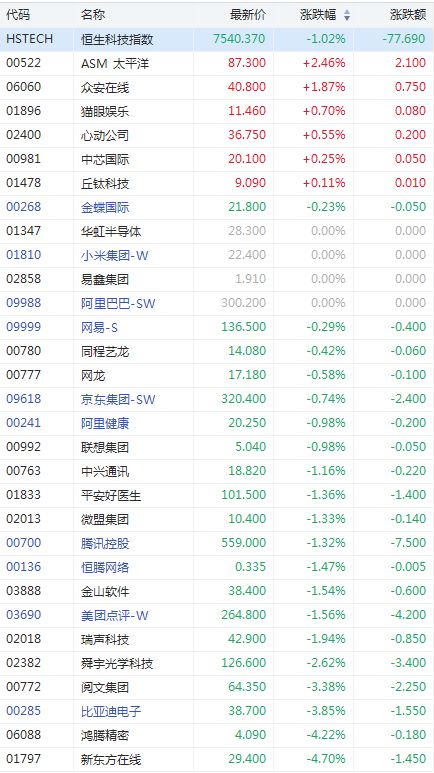 ASM 太平洋涨超2%,领涨指数成分股;众安在线涨1.87%,猫眼娱乐、心动公司、中芯国际、丘钛国际微涨。