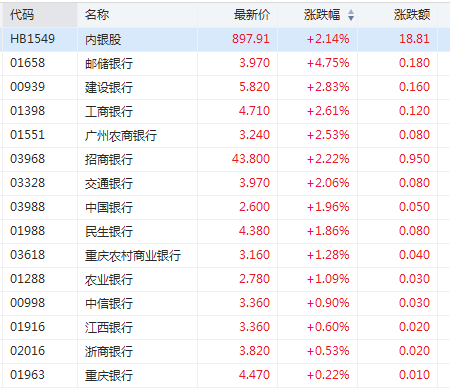 港股内银股走强,邮储银行涨超4%建设银行涨超2%