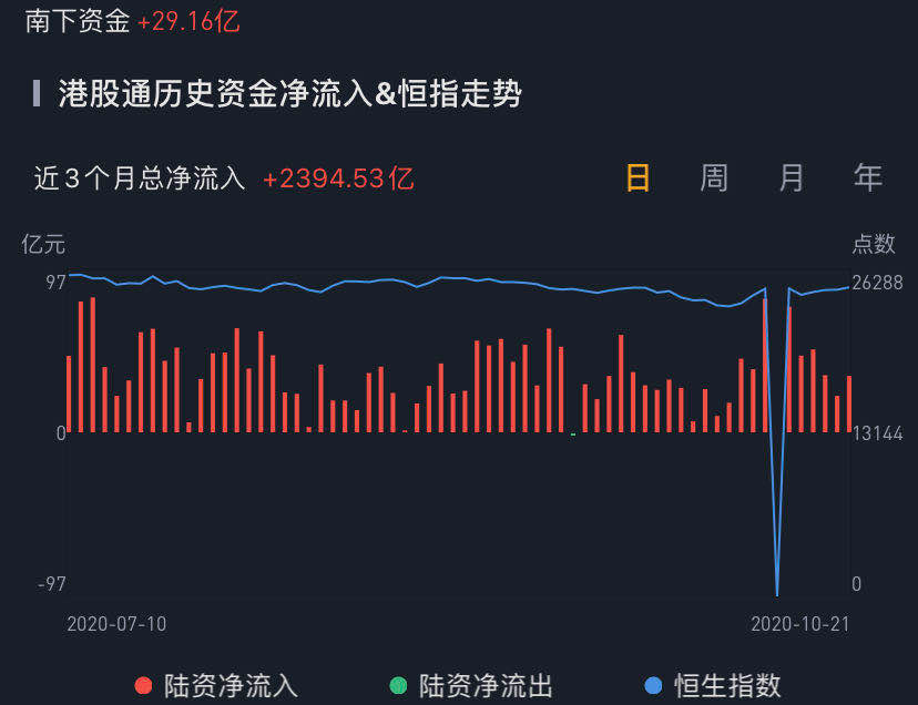 南下资金今日净流入港股29.16亿港元,流入规模较环比略微下滑。