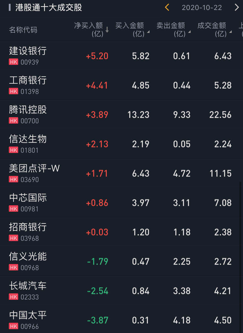 个股方面,今日南下资金净买入建设银行5.20亿港元,净买入工商银行4.41亿港元,净买入腾讯控股3.89亿港元,净买入信达生物2.13亿港元。