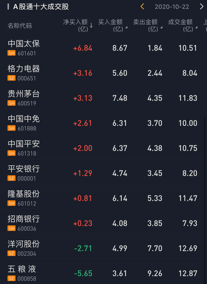 北上资金今日净买入中国太保6.84亿元,净买入格力电器3.16亿元,净买入贵州茅台3.13亿元,净买入中国中免2.61亿元,净卖出五粮液5.65亿元。