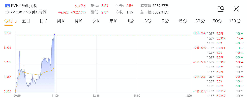 华盛资讯10月22日讯,华瑞服装(EVK)股价一夜暴涨4倍。截止发稿,华瑞服装暴涨402.17%,现报5.77美元,当前总市值8552万美元,成交量为8357万。