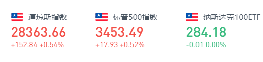 美股周四小幅收高,银行股领涨。截至收盘,道指涨152.84点,或0.54%,报28363.66点;纳指涨21.31点,或0.19%,报11506.01点;标普500指数涨17.93点,或0.52%,报3453.49点。