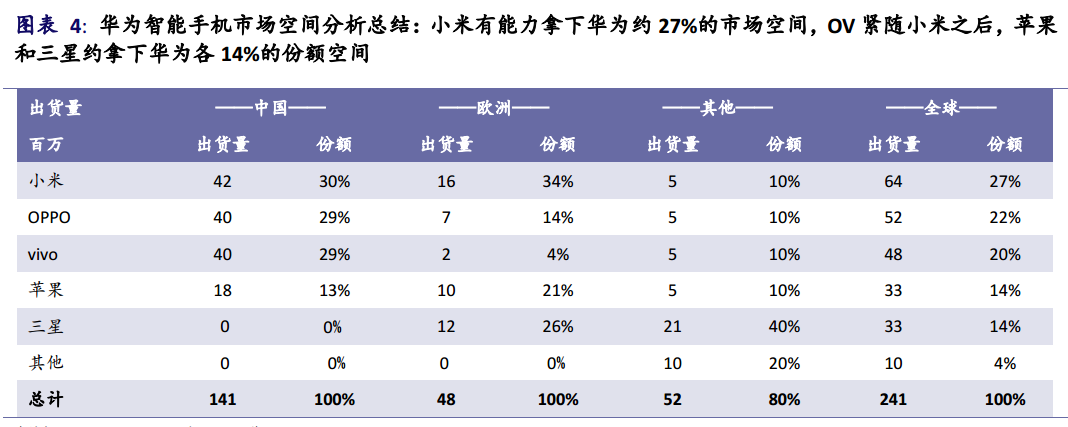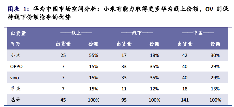 中国线下渠道中,OV(OPPO 和 vivo)依然会保有更大的话语权,因此各会分得华为35%的线下市场空间,而小米可以拿到其中18%的份额。因此,整体来讲,小米可能获得华为在中国30%的市场空间。