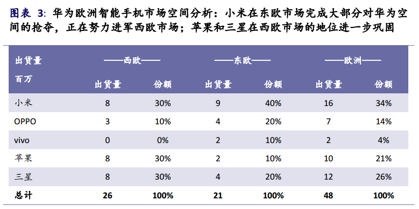 小米、苹果和三星都有望取得华为西欧市场的30%的空间。综上,估算小米可以拿到华为欧洲市场的约34%的份额。