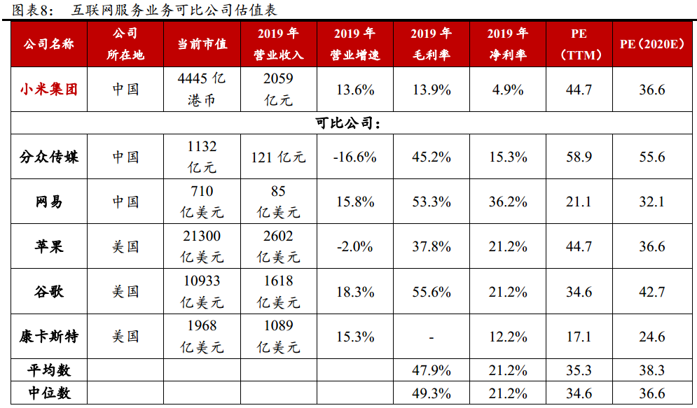 在全球范围内,选取了与小米互联网服务可比度最高的5家公司采用PE估值,平均 PE(TTM)是35.3倍,中位数PE(TTM)是34.6倍,平均PE(2020)是38.3倍,中位数PE(2020E)是36.6倍。