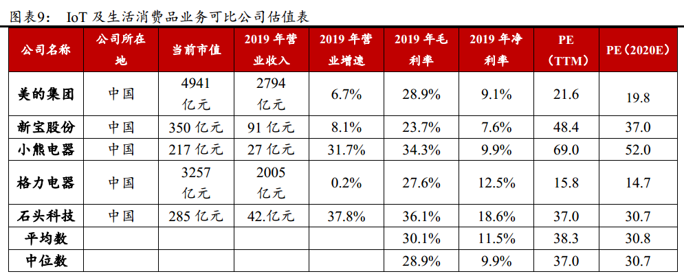 选取白电的代表公司格力,美的,以及小家电的代表公司新宝股份,小熊电器以及小米生态链企业石头科技作为可比公司,平均PE(TTM)是38.3 倍,中位数PE(TTM)是37倍,平均PE(2020)是30.8倍,中位数PE(2020E)是30.7倍。