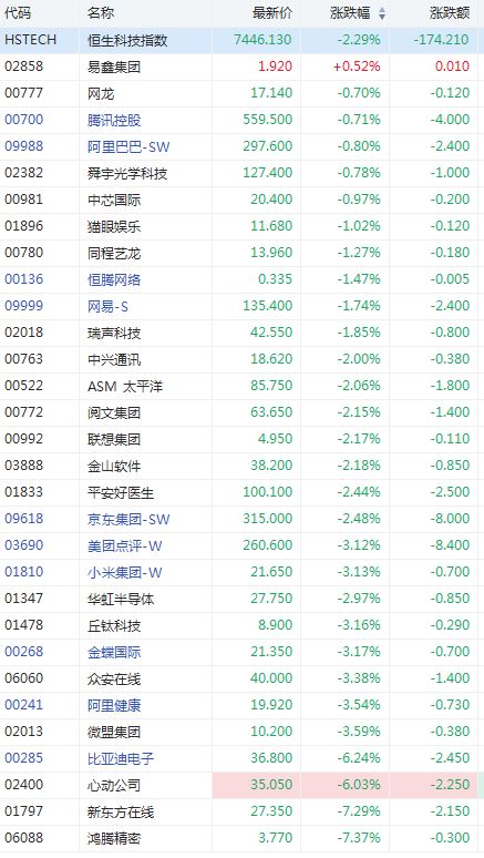 科技股走低恒生科技指数跌超2% 新东方在线、鸿腾跌幅居前
