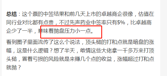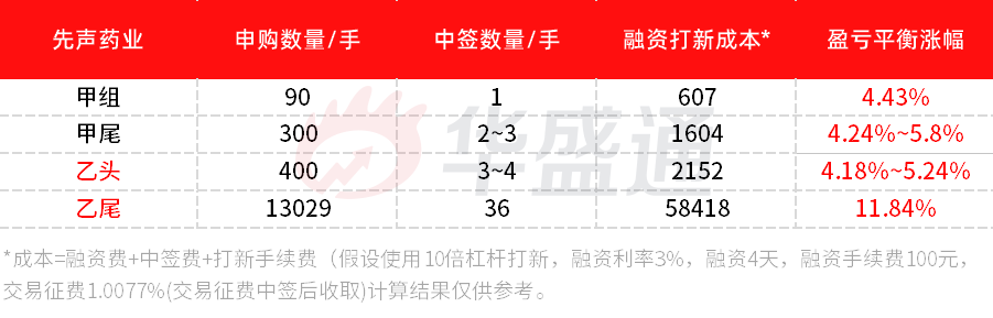 这次的先声药业IPO冻资4天,冻资期相对较短。假设使用10倍杠杆,利率3%,甲组打90手成本大概为607元,大甲组的盈亏平衡点整体为4%-5%。乙头打新成本大概是2152元,盈亏平衡点是4.18%-5.24%。也就是说对大部分投资者来说,涨幅在5%以上就可以盈利,总体来看,打和点较低。