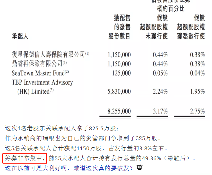 对于先声药业,7位基石投资者锁定了41.25%的股份(绿鞋后35.87%),基石份额相当高,而且都是高瓴、奥博、清池资本这些知名的投资机构,无疑顶头槌多达112张。