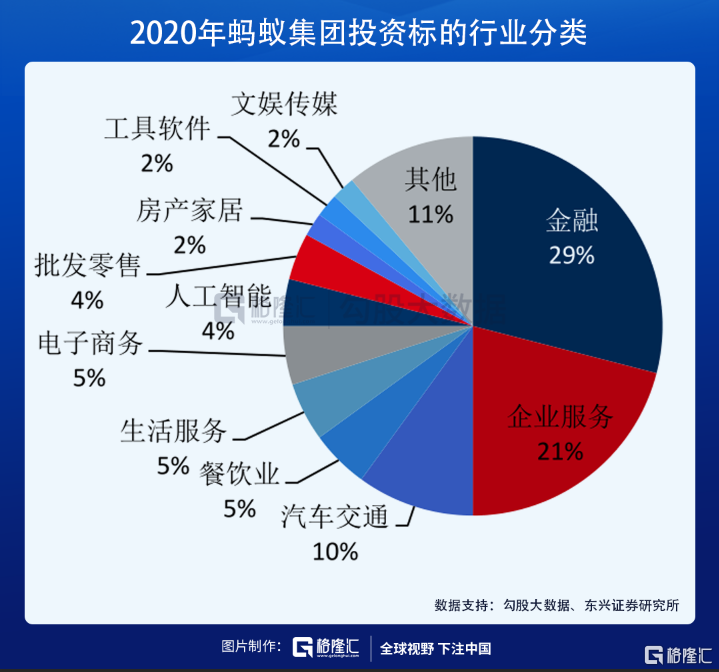 截止2020年上半年,蚂蚁金服共参与197起战略投资事件,覆盖金融、企业服务、出行、餐饮、生活服务、电子商务、人工智能、房产家居、文娱传媒等十多个领域。