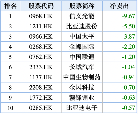 本周,南下资金净卖出信义光能近10亿港元,净卖出比亚迪股份超5亿港元。此外还减持了中国太平、金蝶国际、中国联通等标的。