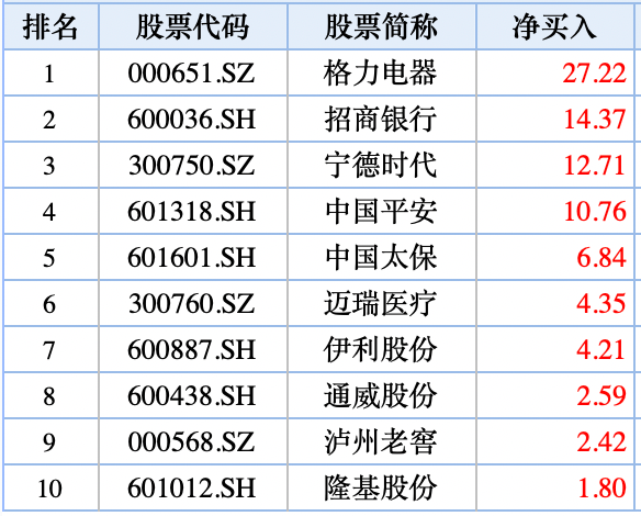 本周,北上资金净买入格力电器27.22亿元,净买入招商银行14.37亿元,净买入宁德时代12.71亿元,净买入中国平安10.76亿元。此外,北上资金还加仓了中国太保、迈瑞医疗、伊利股份等个股。