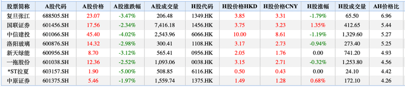 个股方面,复旦张江、国联证券、中信建投、洛阳玻璃、新天绿能等个股仍然位列溢价榜首,投资者可关注相关个股估值回归机会。
