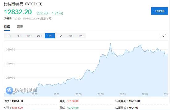 本周五盘中,比特币价格已经较周四明显回落,美股午盘时段一度跌破1.28万美元,较周四的高位跌去400多美元,较周五日内高位跌去300多美元。