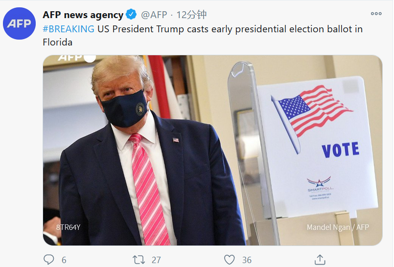 【环球网快讯】法新社刚刚消息,美国总统特朗普当地时间24日在佛罗里达州提前进行了总统选举投票。