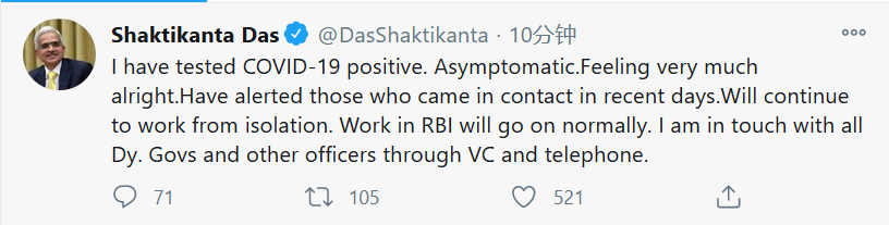 【环球网快讯】印度储备银行(央行)行长沙克蒂坎塔·达斯(Shaktikanta Das)刚刚在推特上称,自己的新冠病毒检测结果呈阳性,目前表现为无症状,并将继续在隔离的环境下工作。
