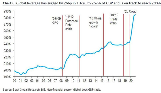 美国银行欧洲信贷策略师Barnaby Martin团队测算,由于受到疫情的影响,绝大多数经济体GDP萎缩,全球央行大放水、发达经济体纷纷采用零利率政策之后,可能在中长期带来的巨大问题就是债务危机。今年上半年,全球债务与GDP的比率飙升至历史新高,达到267%。这一比率在今年一季度跃升11个百分点,二季度进一步攀升15.7个百分点。这是有史以来最大的环比变化。