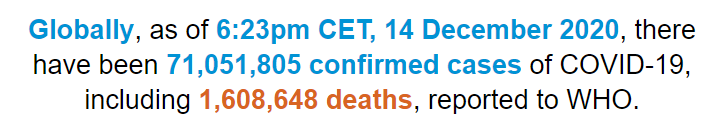 根据世卫组织最新实时统计数据,截至欧洲中部时间12月14日18时23分(北京时间12月15日1时23分),全球累计新冠肺炎确诊病例71051805例,累计死亡病例1608648例。14日全球新冠肺炎确诊病例新增574969例,死亡病例新增8726例。