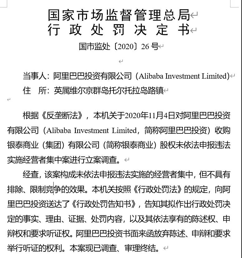 据市场监管总局12月14日消息,根据《反垄断法》规定,市场监管总局对阿里巴巴收购银泰商业股权、阅文集团收购新丽传媒控股股权、深圳市丰巢网络收购中邮智递科技权等三起未依法申报违法实施经营者集中案进行了调查,并于2020年12月14日依据《反垄断法》第48条、49条作出处罚决定,对阿里巴巴投资有限公司、阅文集团和深圳市丰巢网络分别处以50万元人民币罚款的行政处罚。消息一出,阿里、腾讯股价跳水,股价都跌超3%。