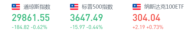 截至收盘,道琼斯指数跌184.82点,跌幅0.62%,报29861.55点;标普500指数跌15.97点,跌幅0.44%,报3647.49点;纳斯达克综合指数涨62.17点,涨幅0.50%,报12440.04点。