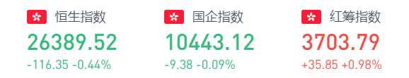 恒生指数开盘涨0.06%,午后急跌近200点,尾盘跌幅稍有收窄。截至收盘,恒生指数跌116.35点或0.44%,报26389.52点,全日成交额达1433.07亿。国企指数跌0.09%,报10443.12点,红筹指数涨0.98%,报3703.79点。