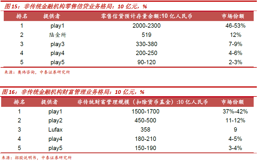 虽然陆金所和蚂蚁集团主营的业务类似,但实质上存在诸多区别,各自是其细分领域的大龙头。据中泰证券: