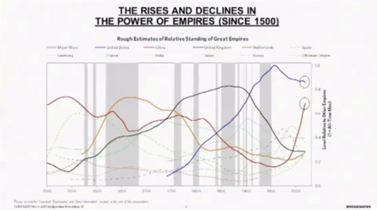 这张图显示了自1500年以来各国的实力指数,我将其汇总起来是为了直观地看到我们在这个大周期中所处的位置。