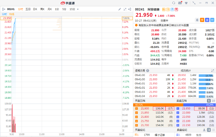 10月27日消息,阿里健康涨超7%,最新市值2952亿港元。