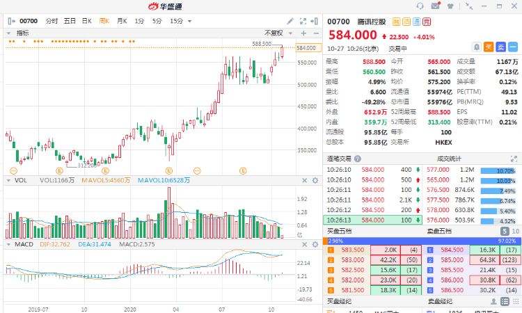 10月27日消息,腾讯控股股价刷新历史新高,现涨4.01%,报584港元,最新市值55976亿港元。