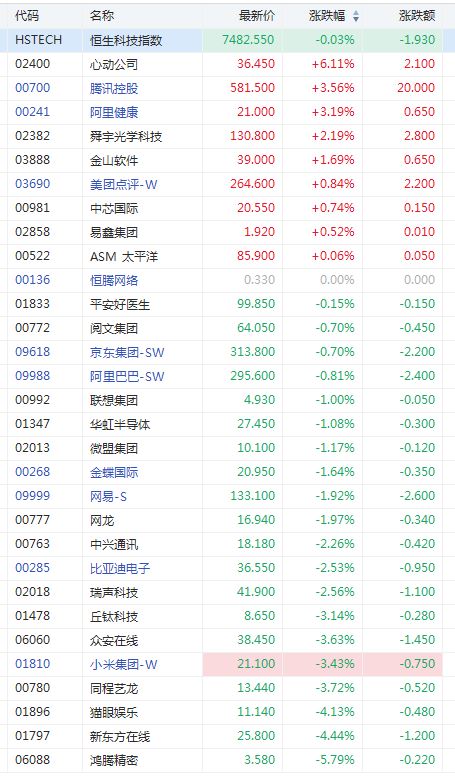 恒生科技指数早间冲高回落,目前微跌0.03%,成分股跌多涨少。
