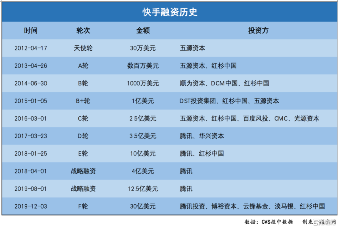 根据CVS投中数据,快手成立以来一共经历了10轮融资。除了最早拿过一笔五源资本(晨兴资本)领投的天使,红杉、顺为、DCM、DST都是快手较为早期的投资人,如果一直没有退出,当年的投资都有几十到上千倍不等的回报。