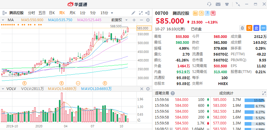 今日(10月27日),腾讯控股早盘涨幅一度逼近5%,股价最高攀至588.5港元再创历史新高,最新市值达55687亿港元,半日市值最高增幅达2587亿港元。