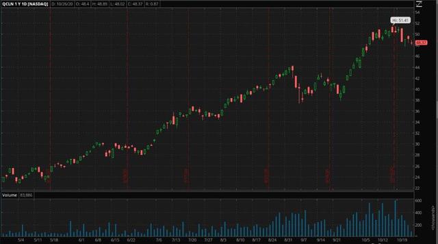 我内心的交易者尖叫着说,现在的机会是在大选前立即出售 QCLN,因为如果拜登获胜,获利回吐可能会引发一种强大的“买入谣言,出售事实”模式。不过,正如我所说,这只是长期趋势的加速,不会有任何变化,因此这也可以说是一笔风险很大、难以定时的交易。拜登获胜后,可能会有人自发地购买 QCLN 之类的产品,这使得获利回吐这个问题更加恶化,所以我暂时不会买。
