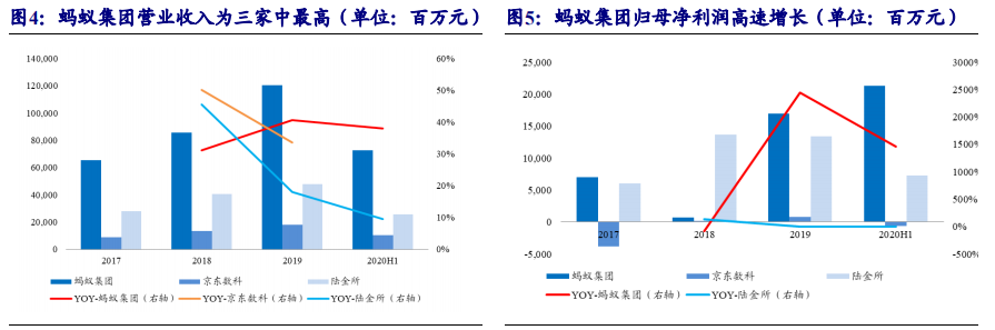 蚂蚁集团营业收入远超京东数科和陆金所,2018 年,陆金所归母净利润为三家中最高,2019 年起,蚂蚁集团净利润高速增长,重夺领先地位,2020H1 差距逐渐明显。2018 年起,蚂蚁集团总资产位居三家公司第一,为陆金所的两倍,远超京东数科,净资产稳居首位。从总体体量上看,蚂蚁集团占领先优势,京东数科体量相对较小。
