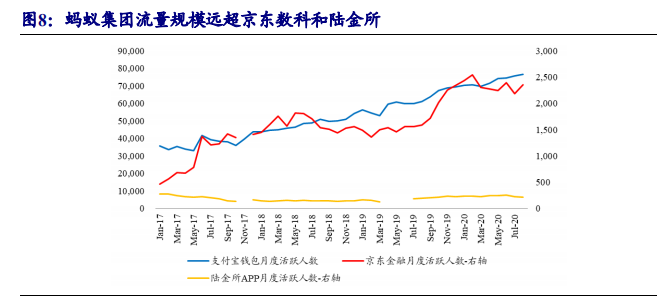 蚂蚁集团流量规模占优。蚂蚁集团以支付宝为流量入口,2020 年 8 月末支付宝月度活跃人数为 7.7 亿人,呈不断上行趋势;京东数科前身为京东金融,京东金融 APP从 2017 年起活跃人数持续攀升,2020 年 8 月末月度活跃人数为 2358 万人;相比蚂蚁集团和京东数科,陆金所整体流量规模较小,陆金所 APP8 月末月度活跃人数 214万人。