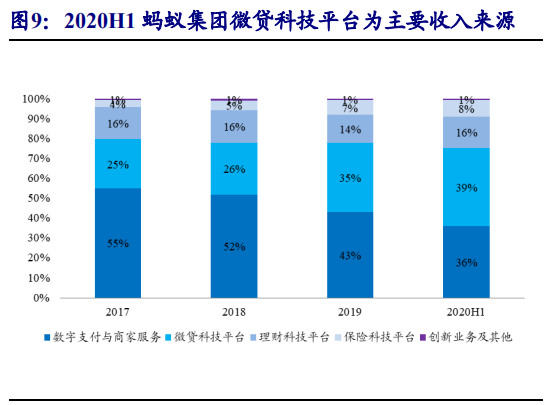 借贷业务为三家公司业务收入主要来源,自 2017 年起,蚂蚁集团中微贷科技平台收入占比从 25%提升至 2020H1 的39%,成为公司第一大业务;