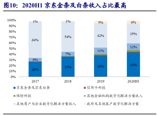 京东数科中,收单及会员管理、票据平台等企业与商户数字解决方案收入占比不断下降,京东金条和京东白条合计收入占比提升至 43%, 在 2020H1 成为第一大业务。