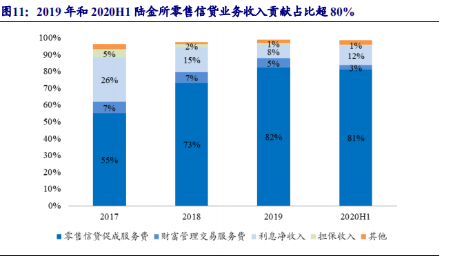 陆金所中,零售信贷近三年均为主要收入贡献来源且呈趋势,2019 年和 2020H1 占比均超 80%。