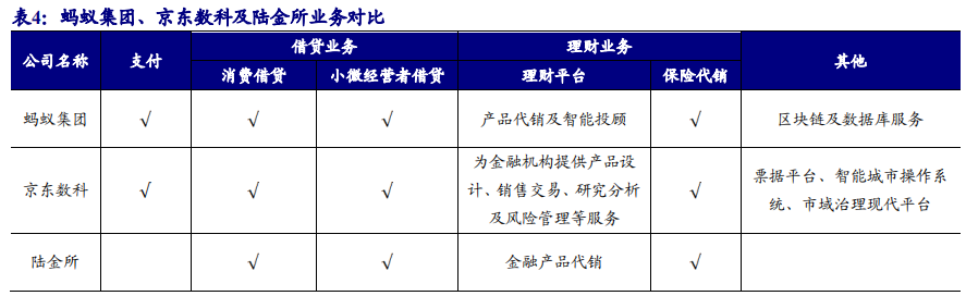 理财业务有所区别,均有保险代销,蚂蚁和京东涉及支付业务