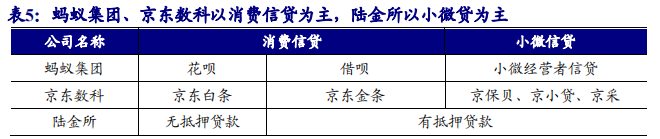 三家公司信贷业务均包含消费信贷及小微信贷,聚焦重点略有差异。蚂蚁集团信贷产品包括花呗、借呗、小微信贷,2020H1 消费信贷产品规模占比约 80%;京东数科消费信贷产品包括京东白条和京东金条,小微信贷产品包括京保贝、京小贷、京采等,京东白条和京东金条为公司信贷业务主要产品;陆金所主要产品包括有抵押贷款和无抵押贷款,其中有抵押贷款借款者均为小微企业,无抵押贷款包含小微企业和个人消费,2020H1 新增贷款规模中,69%为小微企业贷款。