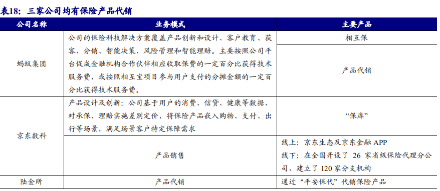 三家均有保险代销业务,京东数科销售渠道更加多元。三家公司均代销保险产品,陆金所代销规模较小,蚂蚁集团和京东数科还为客户提供产品创新、获客、分销等一系列服务。在分销上,京东数科建立了线上和线下销售模式,形成了网销、电销和线下销售的三位一体模式,销售渠道更加多元。