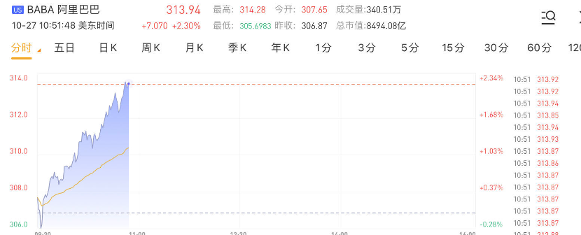华盛资讯10月27日讯,阿里巴巴盘中大涨超2%,股价距315.4美元的历史新高仅一步之遥。