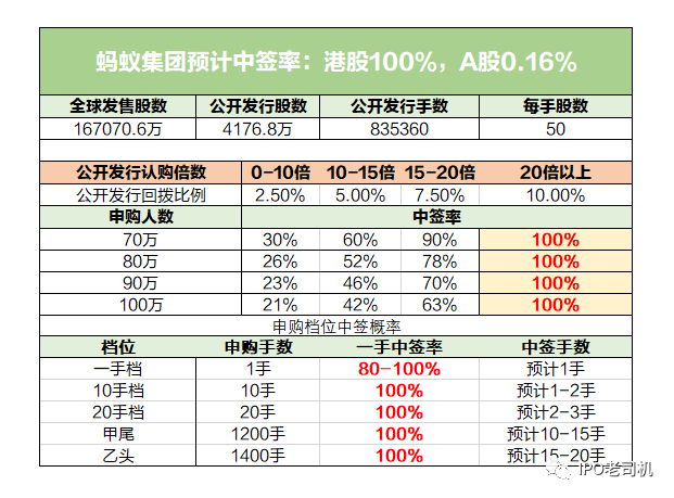 据公开资料,蚂蚁公开发售部分约4176.77万股,每手50股,公开总发行手数83.53万手,甲乙组各41.76万手。按照此前农夫山泉70万人的认购人数来看,保守估计蚂蚁的认购人数在80-100万之间,大概率超购20倍以上,根据回拨机制,公开发售能获得10%的回拨,最终公开配售总手数可达167万手(甲乙组各167万手),一手中签率接近100%。