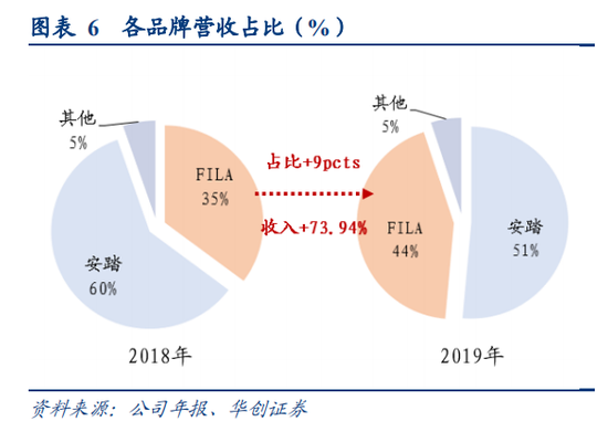 其次,营收的高速增长让FILA品牌在集团中的占比大幅提升,由2018年的35%提升至44%,距离核心品牌安踏一步之遥。