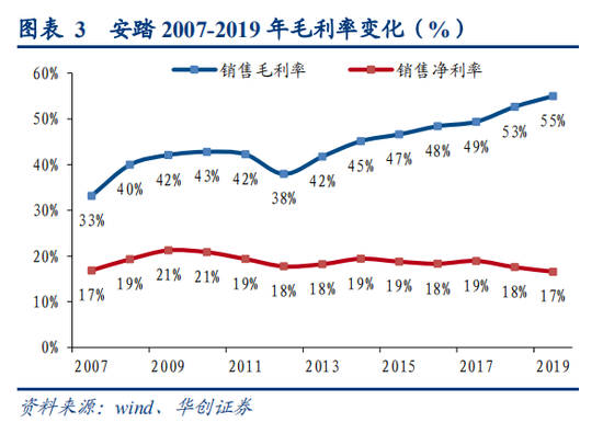 空头对于安踏体育最大的质疑点,集中于过高的毛利率:近年来,安踏体育的毛利率由38%一路提升至55%。