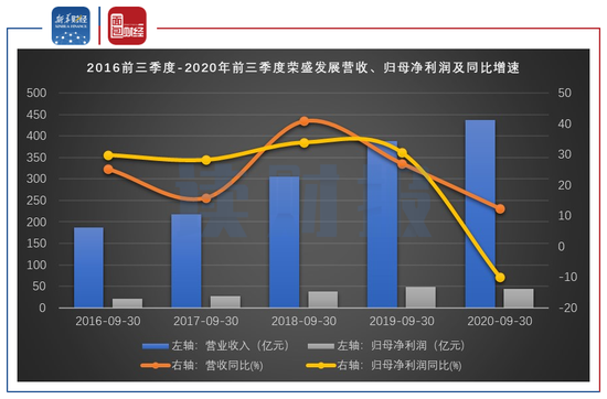 图1:2016前三季度-2020年前三季度荣盛发展营收、归母净利润及同比增速