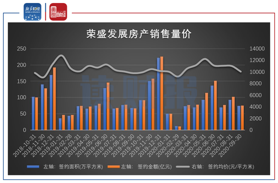 2020年前三季度,荣盛发展累计实现签约金额737.12亿元,同比增长8.67%;累计实现签约面积671.42万平方米,同比增长5.95%;签约均价10978.52元/平方米,同比增长2.57%。其中,公司第三季度实现签约金额254.87亿元,同比上升19.94%,环比下降25.78%;实现签约面积237.2万平方米,同比上升12.4%,环比下降20.63%;签约均价10744.94元/平方米,同比上升6.71%,环比下降6.49%。